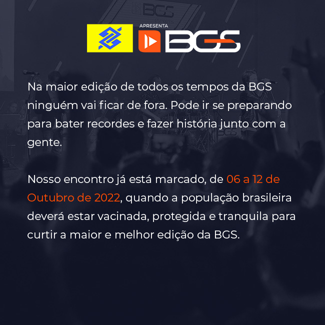 E ai, galera! Tudo bem? Então, vim trazer uma notícia para vocês: a Brasil Game Show anunciou que a 13ª edição será adiada e ocorrerá entre 6 e 12 de outubro de 2022. A data foi escolhida para quando o povo brasileiro estiver vacinado, protegido e tranquilo para assim aproveitar a melhor edição de todos os tempos! A BGS evita o grande encontro devido à pandemia de COVID-19, mas promete contemplar os fãs com muitas novidades. Uma das novidades: a duração do evento, que passará a ter sete dias em vez de cinco, e certamente incluindo o dia para imprensa e convidados.