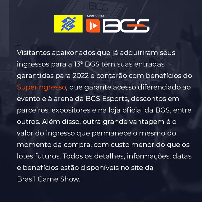 A BGS também reforça quem já obteve os ingressos para a 13ª edição têm suas entradas garantidas para 2022, e além disso contarão com benefícios do Superingresso, que garante acesso ao evento e à arena da BGS Esports, descontos em parceiros, expositores e na loja oficial da Brasil Game Show. Enfim, maiores informações, datas e benefícios já estão disponíveis no site da Brasil Game Show.