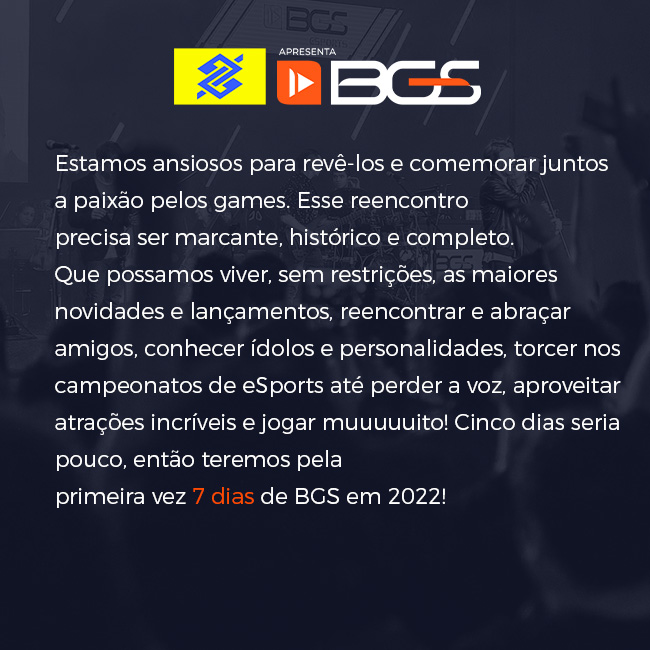 Estamos ansiosos para revê-los e comemorar juntos a paixão pelos games. Esse reencontro precisa ser marcante, histórico e completo. Que possamos viver, sem restrições, as maiores novidades e lançamentos, reencontrar e abraçar amigos, conhecer ídolos e personalidades, torcer nos campeonatos de eSports até perder a voz, aproveitar atrações incríveis e jogar muuuuuito! Cinco dias seria pouco, então teremos pela primeira vez 7 dias de BGS em 2022. Na maior edição de todos os tempos da BGS ninguém vai ficar de fora. Pode ir se preparando para bater recordes e fazer história junto com a gente.