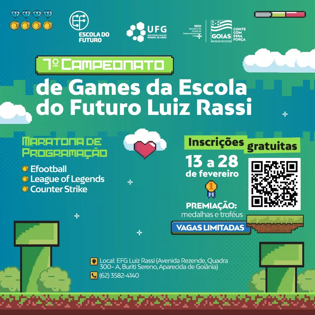 Nos dias 02 e 03 de Março, teremos o 1º Campeonato de Games da EFG Luiz Rassi, que acontecerá em Aparecida de Goiânia! Esse campeonato sensacional contará com as seguintes modalidades: Maratona de Programação, Efootball, League of Legends e Counter Strike. Certamente incrível, não é mesmo? Você não pode perder a oportunidade! A melhor parte é que as inscrições são abertas para alunos das EFGs e para o público externo em geral.