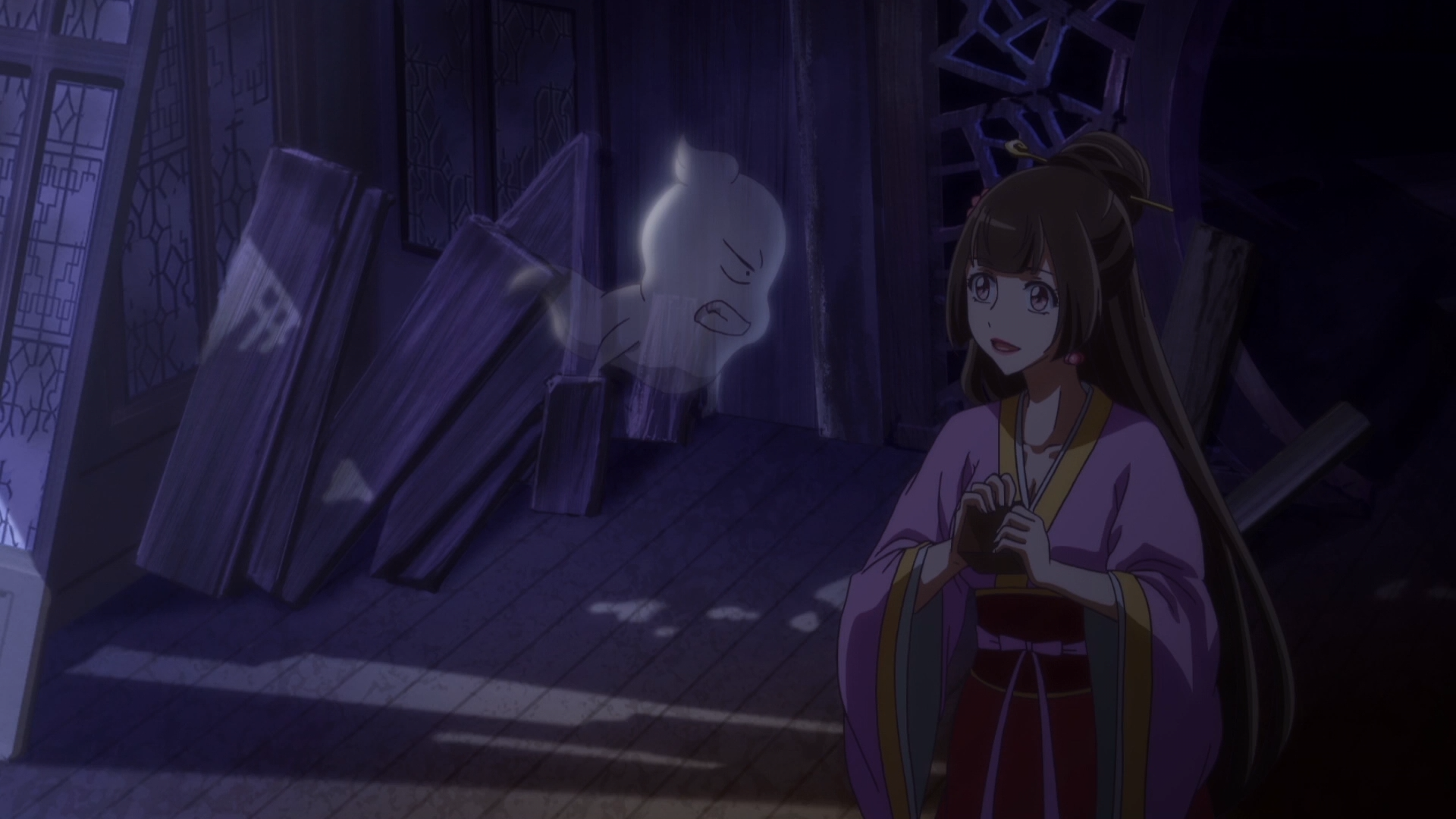 Sorte que Qian Yunxi tem um amigo fantasma chamado Mochi que a faz companhia e a ajuda a arrumar todo o Pavilhão da Serenidade. E, posteriormente, eles conhecem outro fantasma chamado Gergelim, que era a causa da assombração. Basicamente: ela faz a amizade com todos os fantasmas e fadas que ela conhece por ali. Dessa forma, a animação fica muito legal ao mostrar criaturas tão fofinhas e divertidas!