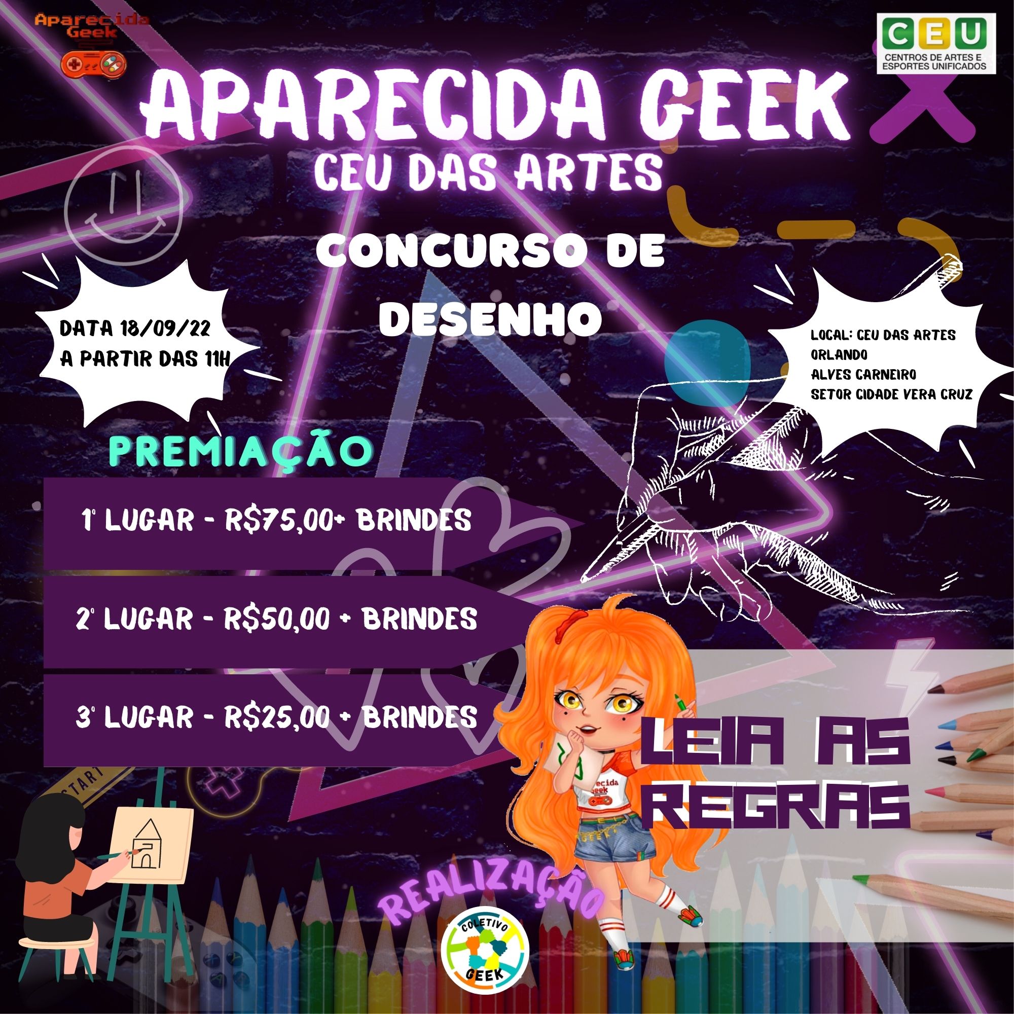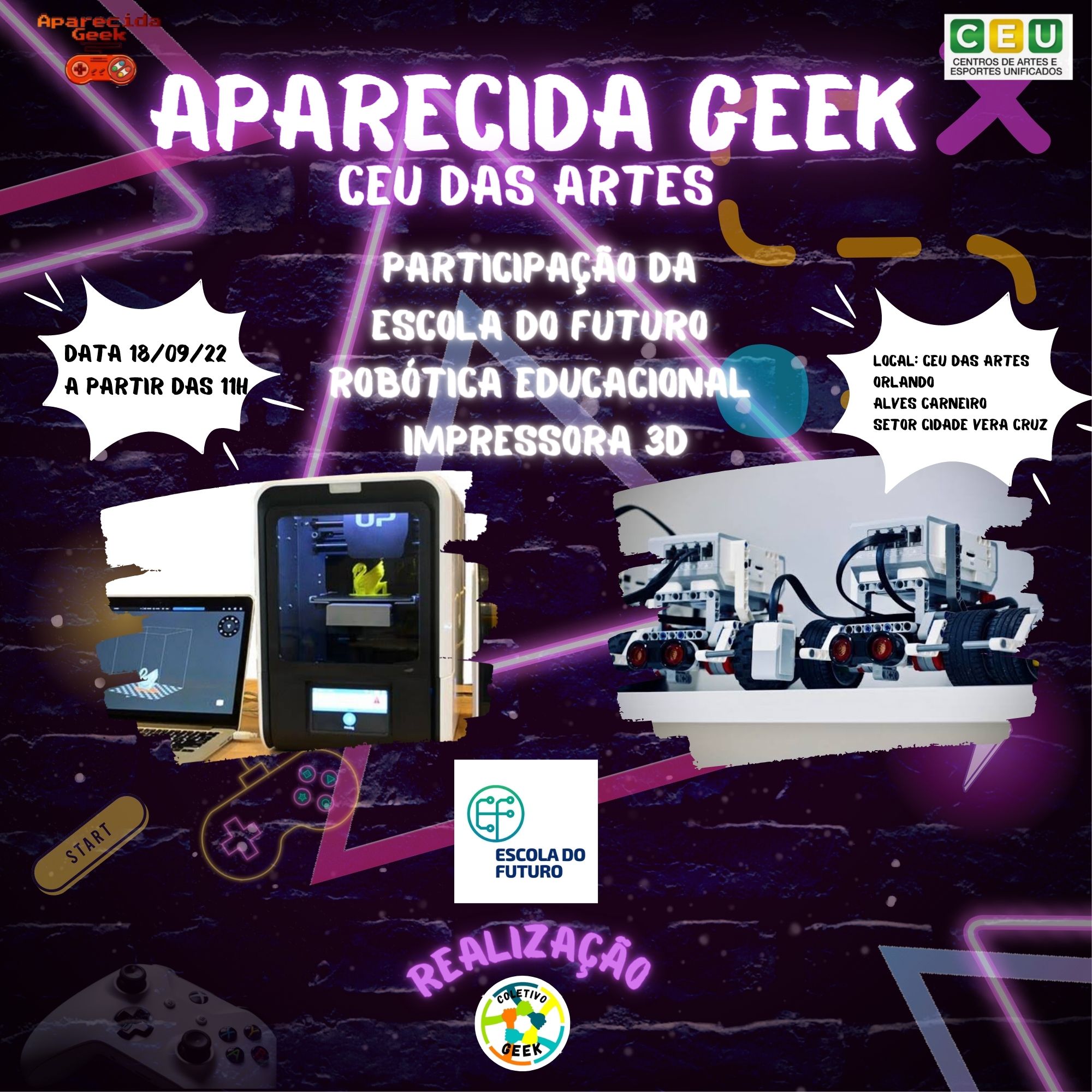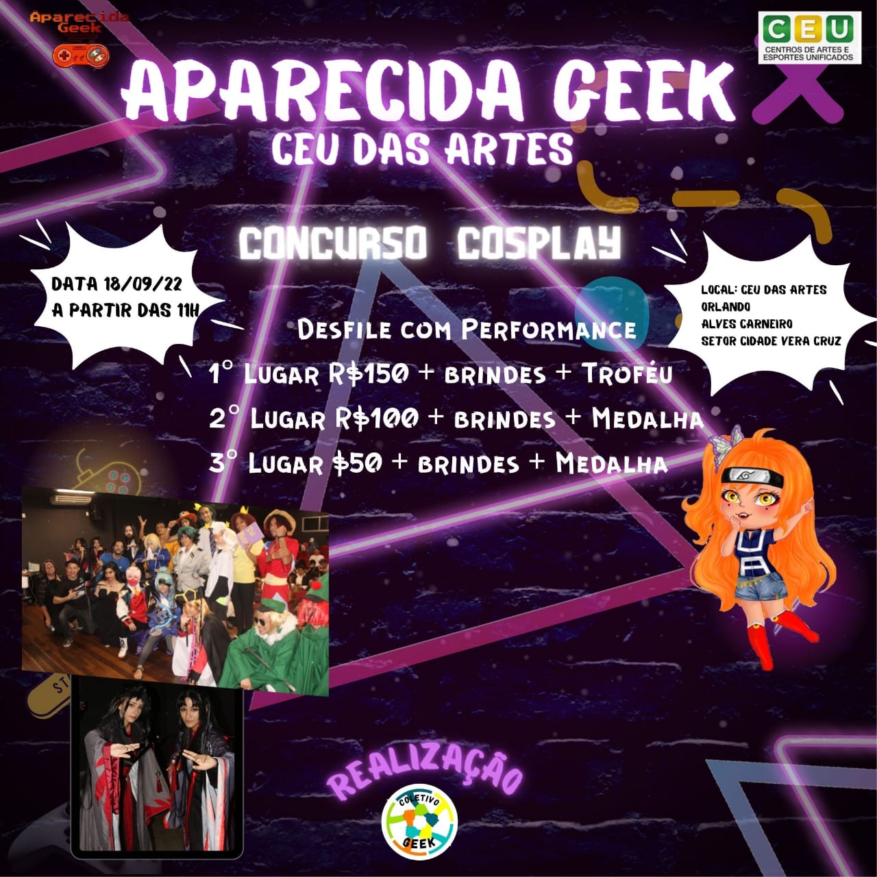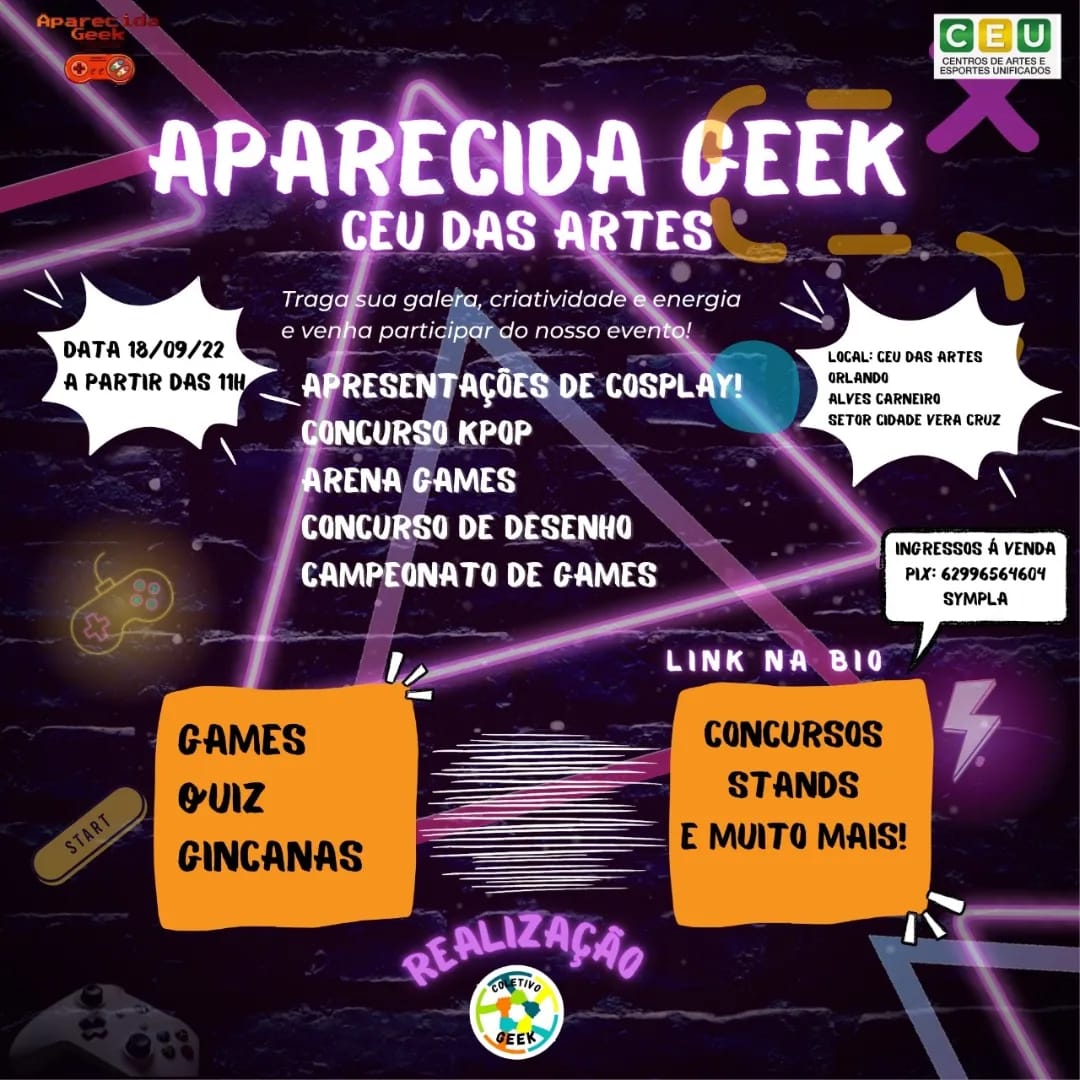 Venha se divertir no próximo evento e traga sua família e seus amigos para se divertirem com você! Afinal de contas, Aparecida Geek Especial CEU das Artes ocorrerá em 18 de setembro de 2022! É diversão garantida para aproveitarmos! Descrição do evento CEU das artes Orlando Alves Carneiro em Aparecida de Goiânia: