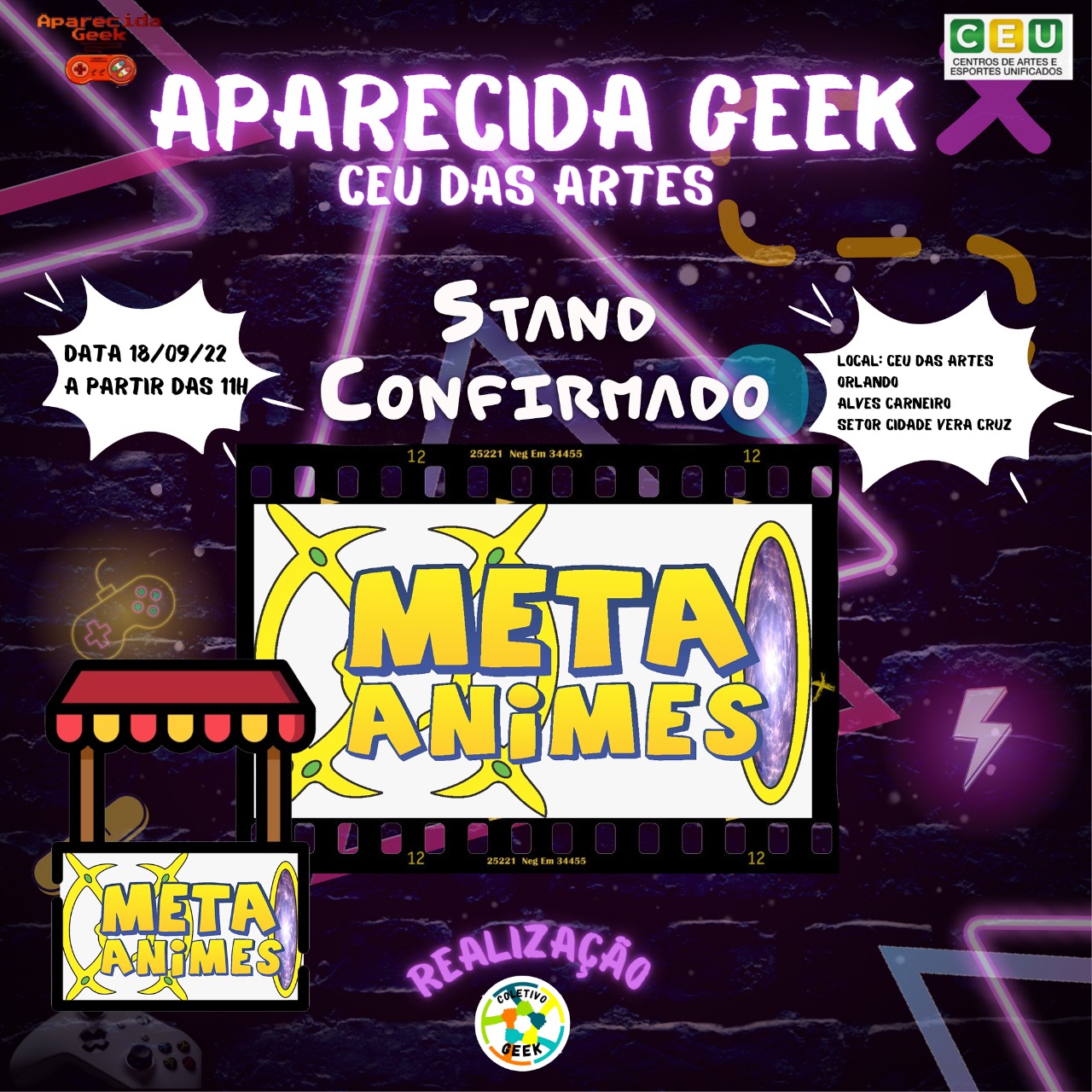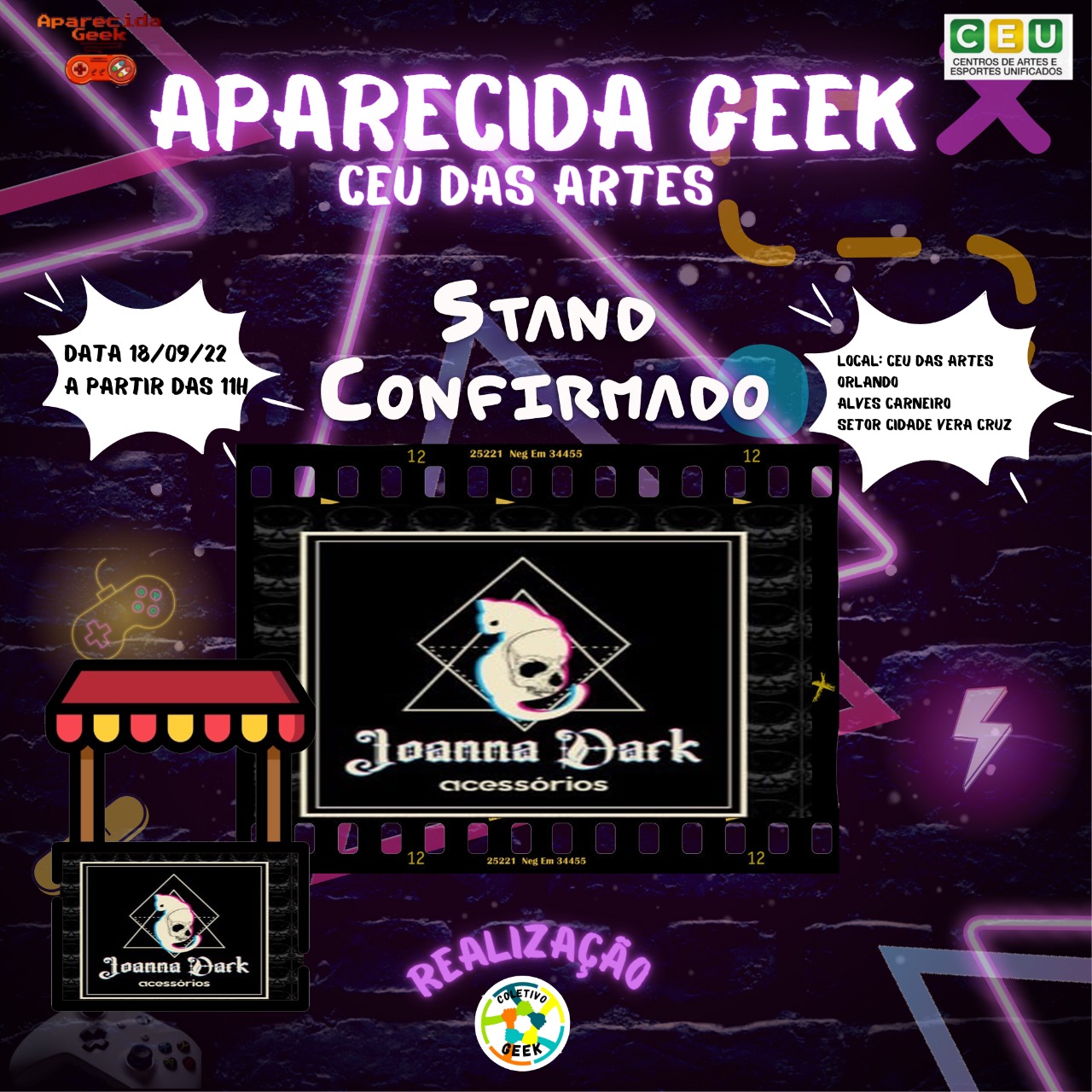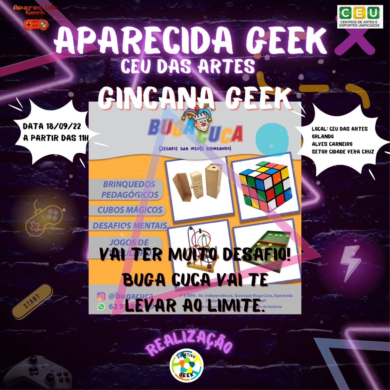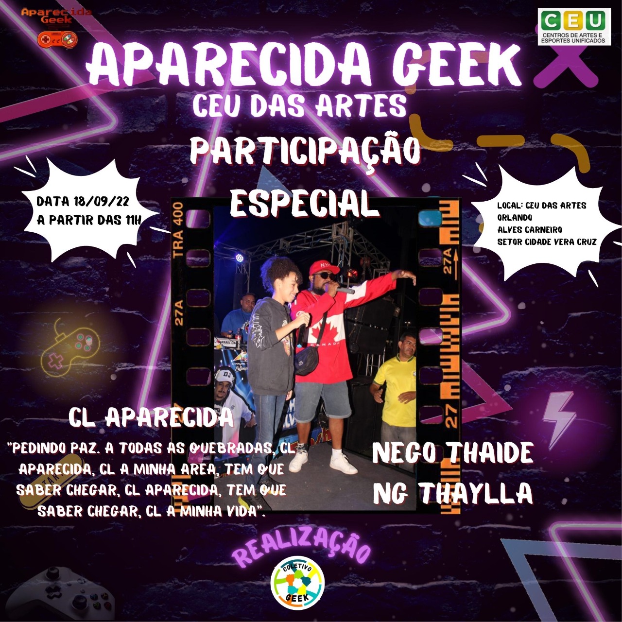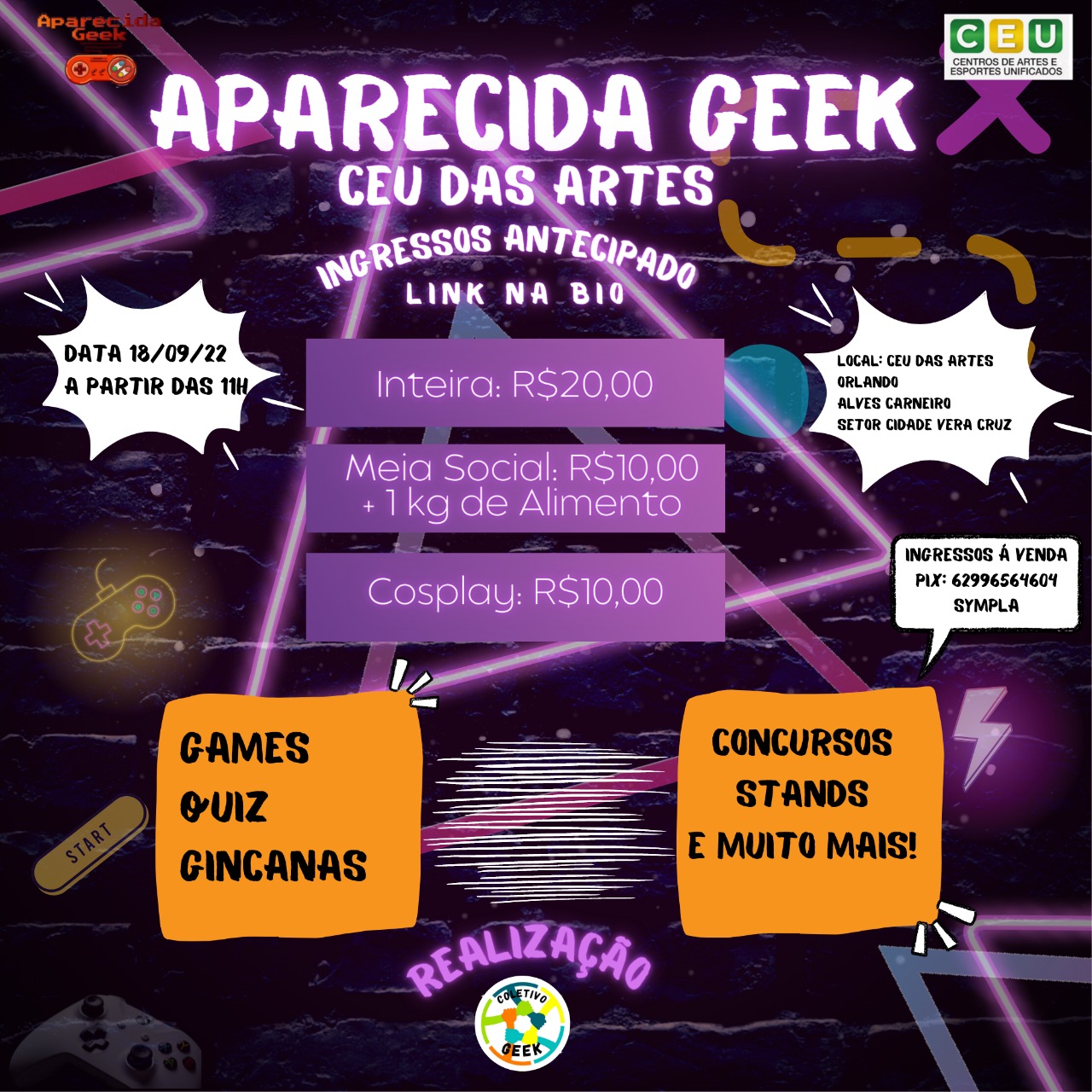 Venha se divertir no próximo evento e traga sua família e seus amigos para se divertirem com você! Afinal de contas, Aparecida Geek Especial CEU das Artes ocorrerá em 18 de setembro de 2022! É diversão garantida para aproveitarmos! Descrição do evento CEU das artes Orlando Alves Carneiro em Aparecida de Goiânia: