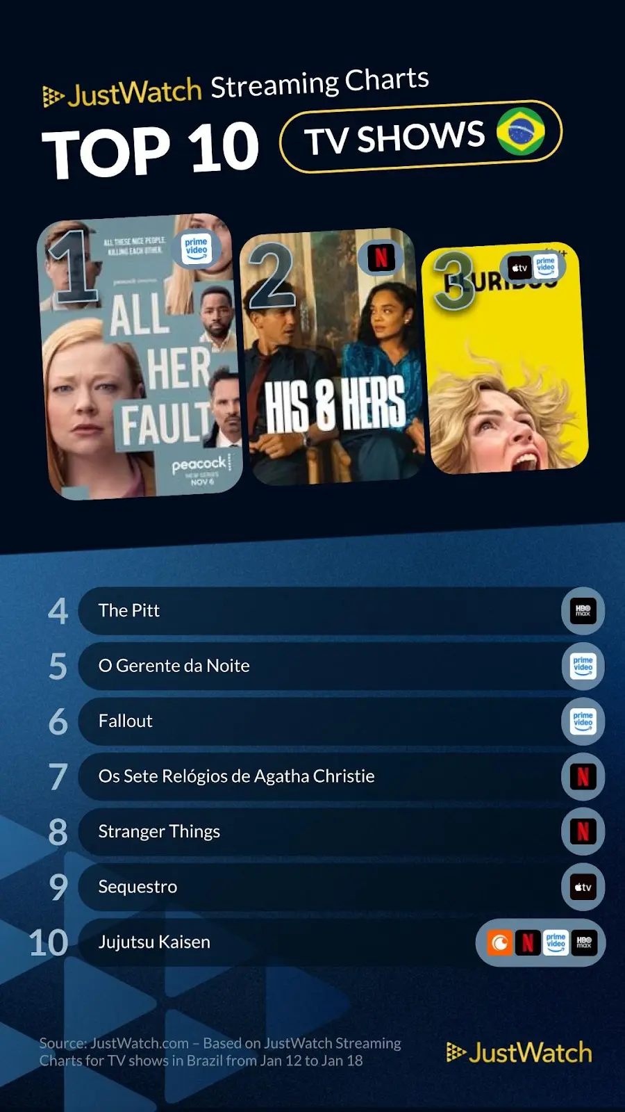 No segmento de filmes, o grande destaque do período foi The Rip, que liderou o ranking semanal e se consolidou como o título mais consumido pelos usuários brasileiros, seguido por One Battle After Another. Já entre as séries, o topo do ranking ficou com All Her Fault, suspense disponibilizado na Prime Video e que é o topo da lista há mais de duas semanas. Stranger Things permanece na lista desde dezembro de 2025 e, além disso, os animes voltam a se destacar graças a Jujutsu Kaisen. Confira abaixo a lista completa: