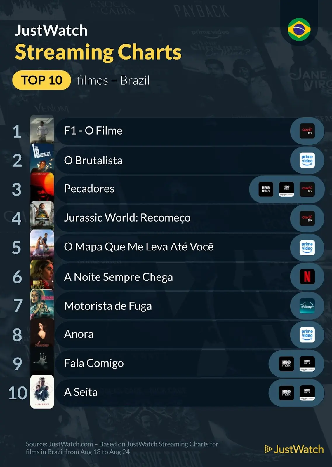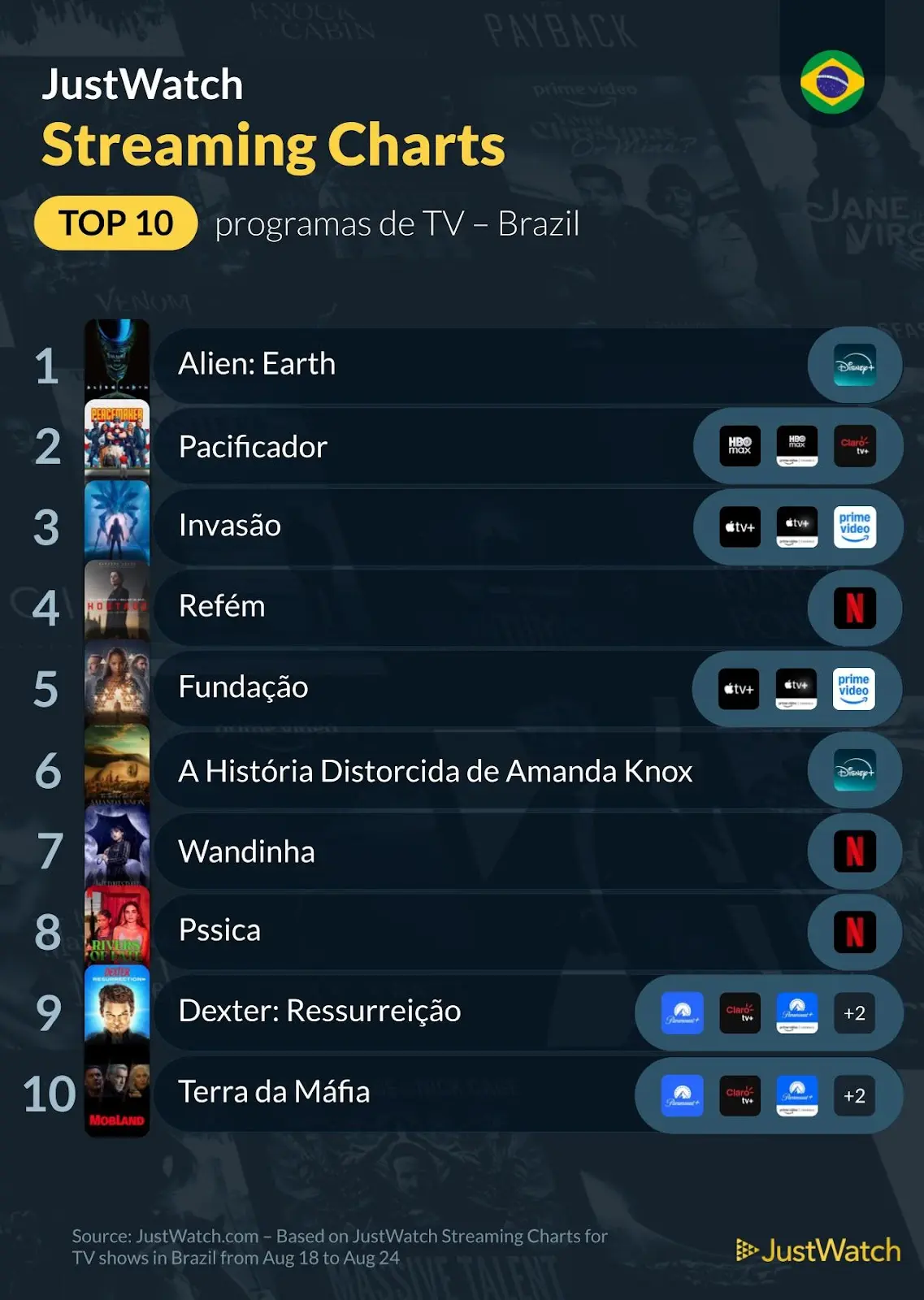 JustWatch divulga ranking das produções mais assistidas no Brasil entre 18 a 24 de agosto de 2025