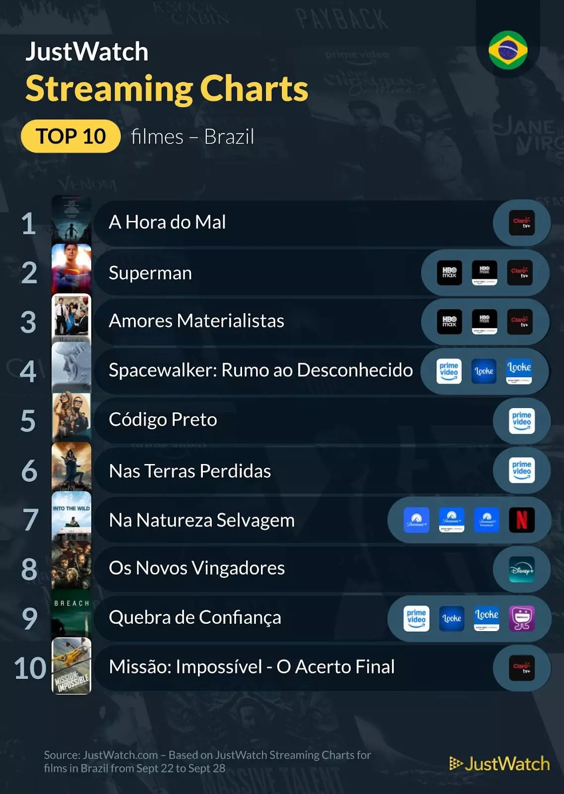 Confira abaixo as listas completas com os conteúdos mais assistidos no Brasil entre os dias 22 a 28 de setembro de 2025: