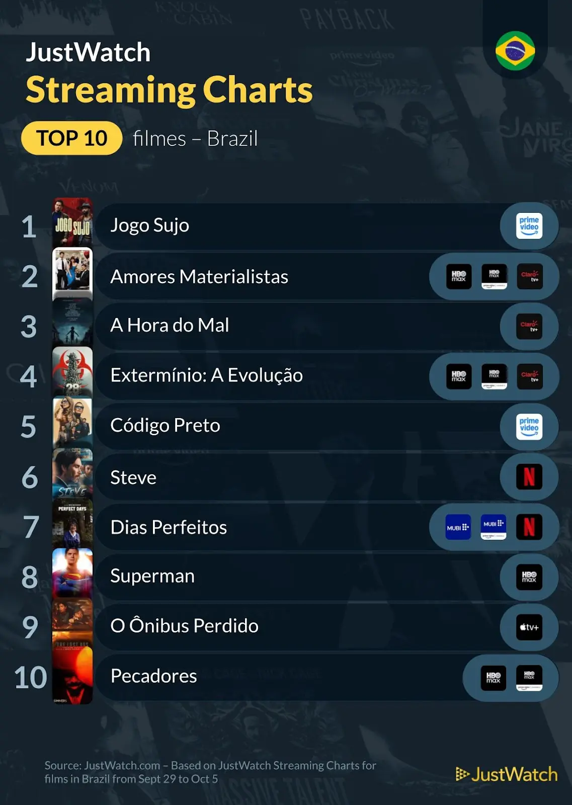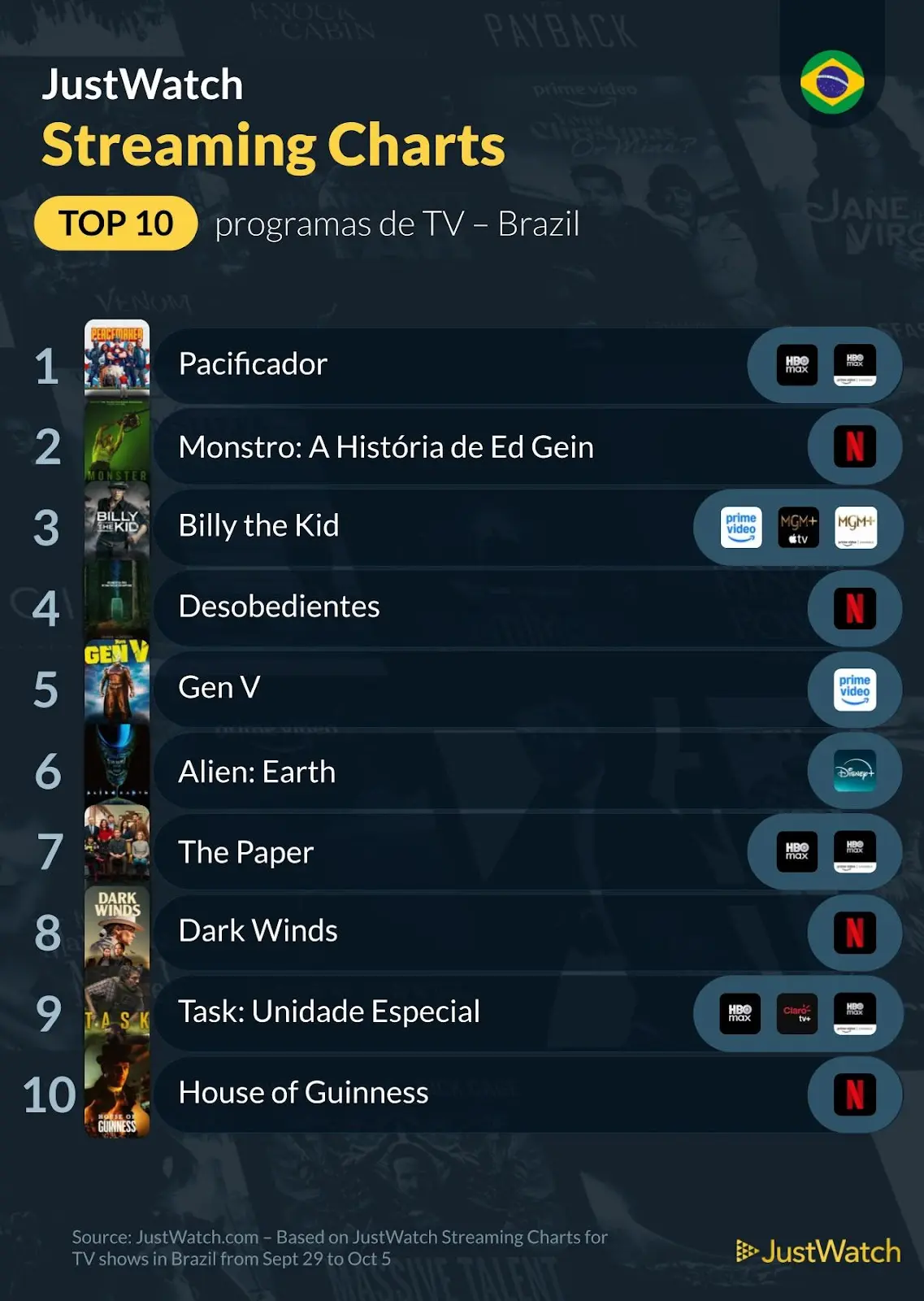 JustWatch divulga ranking das produções mais assistidas no Brasil entre 29 de setembro a 5 de outubro de 2025