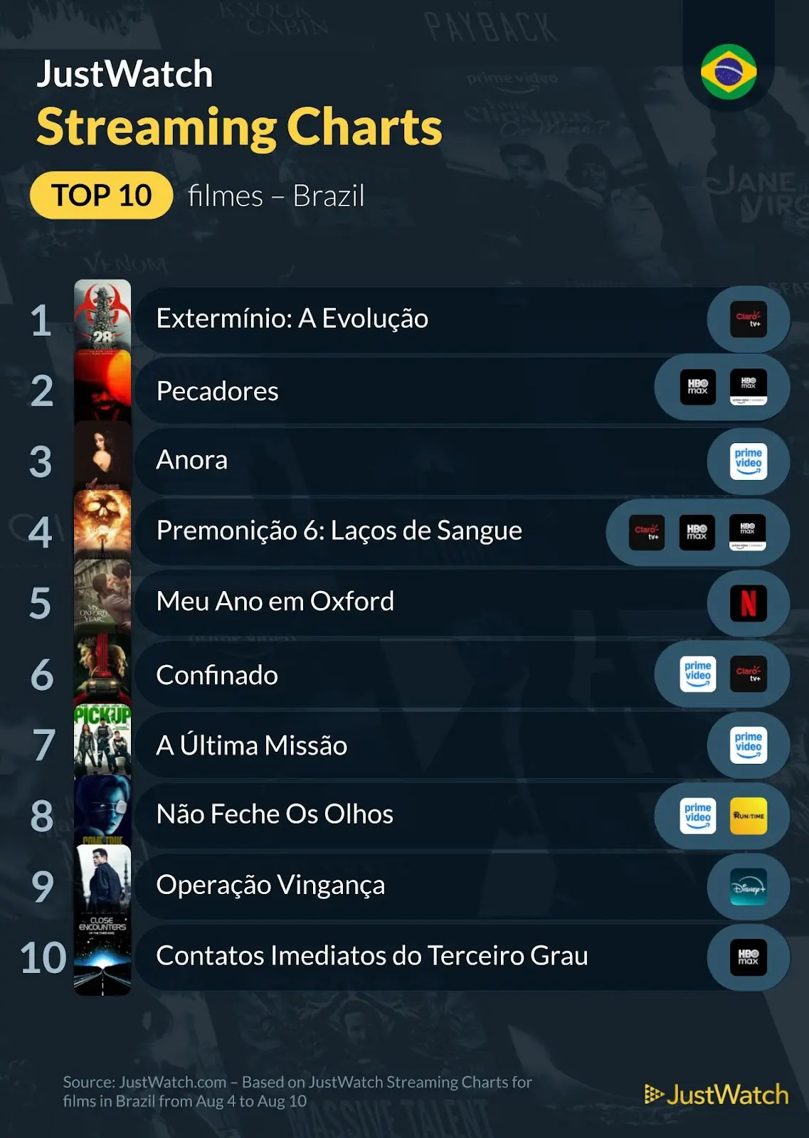 Entre os filmes, o topo vai para Extermínio: A Evolução (2025), terror dirigido por Danny Boyle; produção é seguida por Pecadores (2025), filme de terror dirigido por Ryan Coogler, e por Anora (2024), vencedor do Óscar de 2025 na categoria de Melhor Filme. Entre as séries, um dos destaques continua sendo para Sandman, adaptação dos famosos quadrinhos da década de 1980 e disponível na Netflix. Dessa vez, entretanto, o topo das séries mais assistidas é para Wandinha, adaptação das obras de Charles Addams e também disponível na Netflix. Confira abaixo as listas completas com os conteúdos mais assistidos no Brasil entre os dias 4 a 10 agosto de 2025 de 2025: