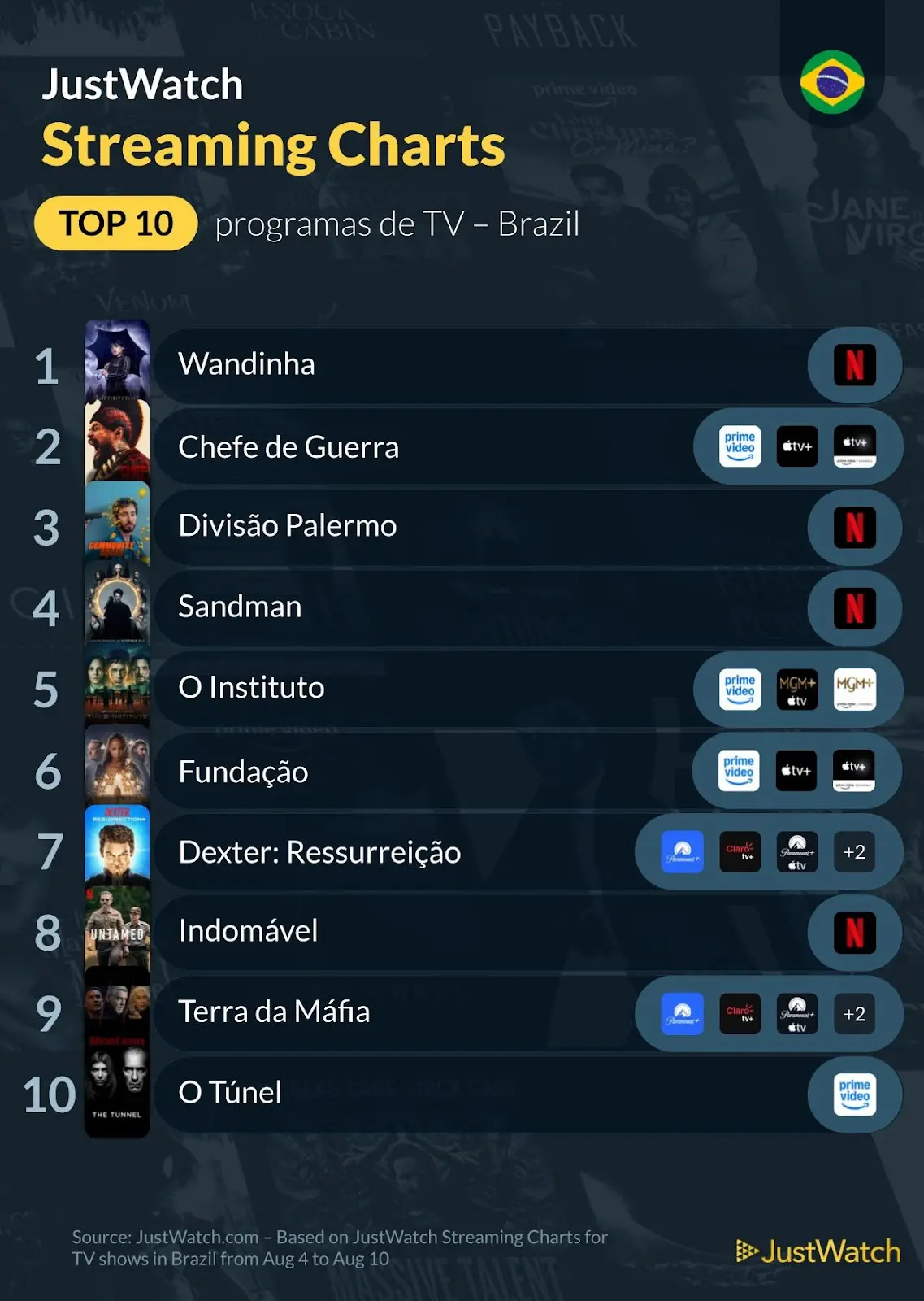 O JustWatch, reconhecido como o maior guia de streaming do mundo, divulgou o ranking com os conteúdos mais assistidos no Brasil entre os dias 4 a 10 agosto de 2025. A plataforma, que conta com mais de 55 milhões de usuários mensais em todo o mundo, foi desenvolvida para auxiliar o público a encontrar de forma rápida, prática e legal onde assistir a filmes, séries e eventos esportivos online, reunindo informações de serviços como Netflix, Prime Video, Disney+, HBO Max, Apple TV+ e muitos outros.