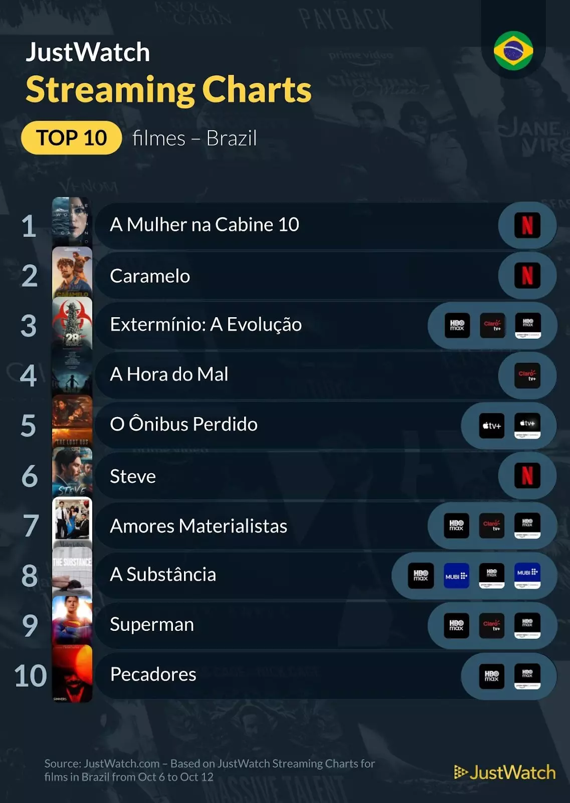 Confira abaixo as listas completas com os conteúdos mais assistidos no Brasil entre os dias 6 a 12  de outubro de 2025:
