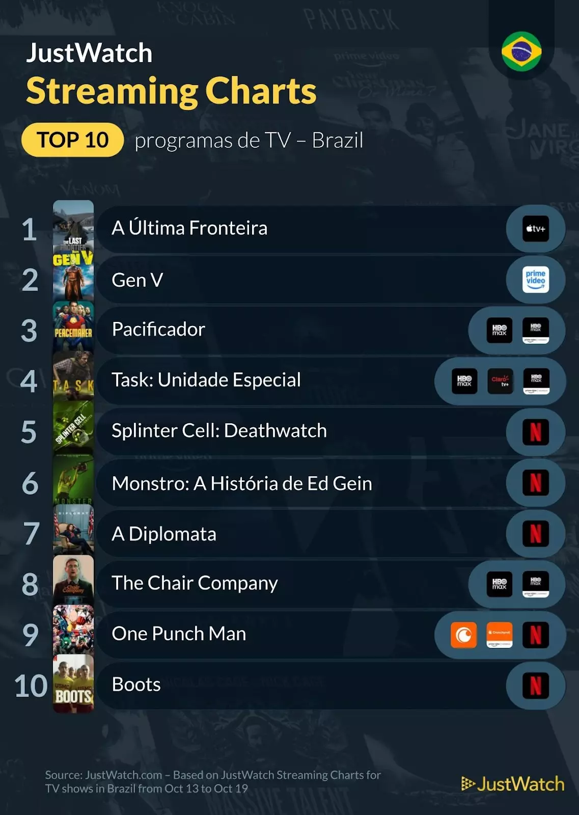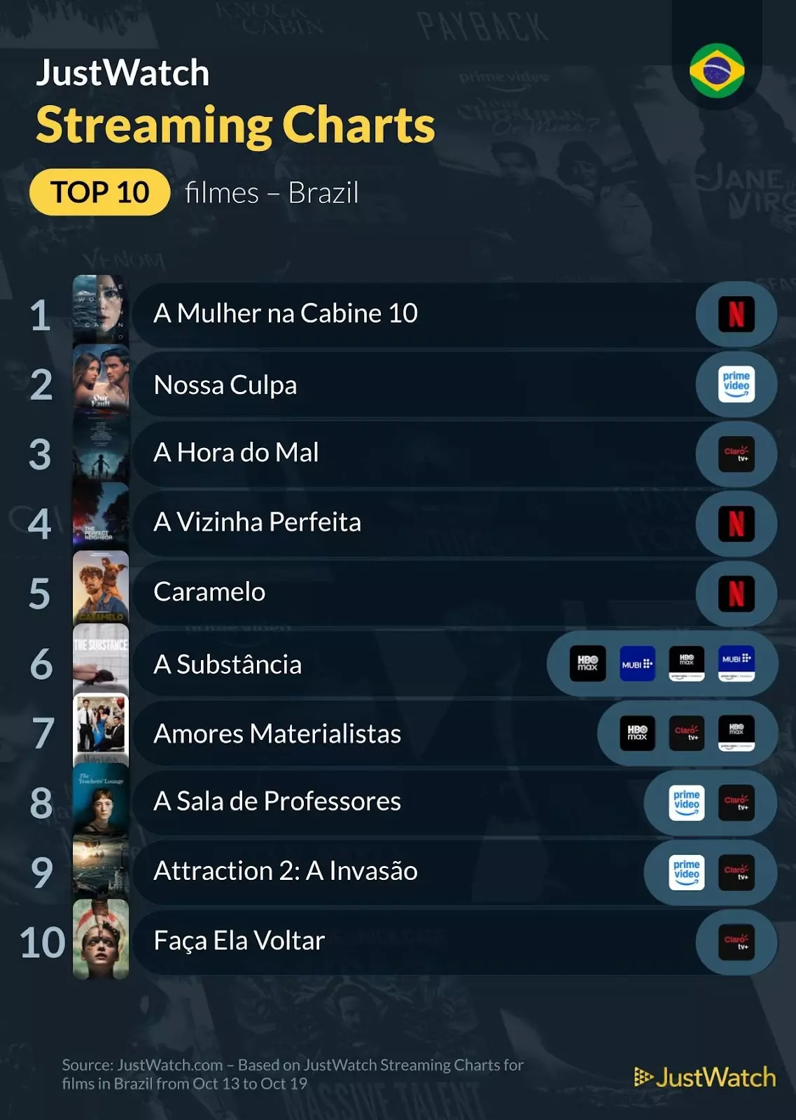 JustWatch divulga ranking das produções mais assistidas no Brasil na última semana (13 a 19 de outubro de 2025)