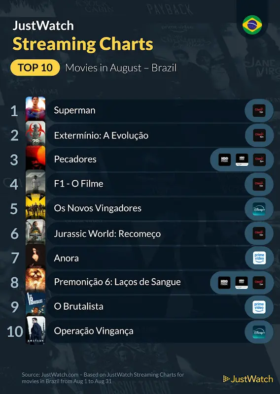 O JustWatch, plataforma referência para busca e comparação de conteúdos em serviços de streaming, revelou os rankings das produções mais assistidas no Brasil durante o mês de agosto de 2025. A lista, enviada por e-mail à nossa redação, traz os dez filmes e as dez séries que dominaram as telas dos assinantes brasileiros, além das informações sobre as plataformas onde cada título está disponível.
