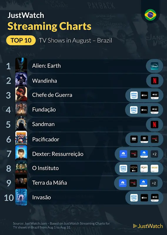 JustWatch divulga ranking das produções mais assistidas nos streamings no Brasil em agosto de 2025